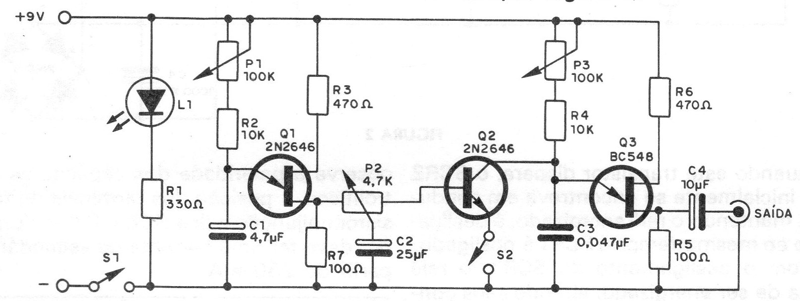 This project was found in a documentation from 1980. It is a central of sound effects, a simple circuit with which you can generate the most diverse sounds in your amplifier equipment. Two relaxation oscillators are used with unijunction transistors that work interdependently. Potentiometers P1 and P3 control the frequency of effects and potentiometer P2 the variation mode. The output of the device must be connected to the input of your amplifier or to a mixer if you want to superimpose your signals on recordings, etc.