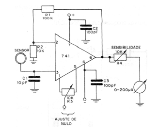 A simple electroscope can be made only with a 741, without the need for field effect transistors or other sensitive components. The gain, of course, is not the greatest, but it serves perfectly to acknowledge the presence of charges on bodies. The complete circuit is shown in the figure. The sensor can be a small ring or a metal sphere that will be connected to the integrated non-inverting input. The instrument can be a common 200 uA VU-meter or the multimeter itself. The null adjustment will be necessary if it is not possible to obtain the minimum marking of the instrument in the no load condition. The 9 - 0 - 9 V symmetrical power supply can be formed by 2 common batteries or symmetrical as many suggested on this website.