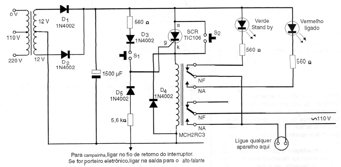 This circuit, found in a 1997 publication, activates a lamp or a monitoring camera when the bell is activated. The circuit is reset by S2. The circuit has LED indicators to indicate whether the load is activated or not. The transformer is 500 mA or more.