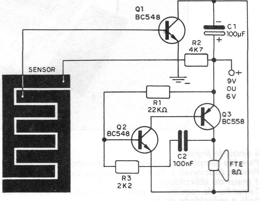 The circuit in the figure shows that it is an oscillator driven directly by the conduction of Q1 which depends on the humidity in the sensor. The reader suggests that this circuit be used as a rain or leak detector, having based its elaboration on the windshield wiper published on the website. The sensor can be made with a common printed circuit board (with the format shown in the figure that gives the diagram) or with two wire screens separated by a piece of porous paper. The frequency of the oscillator can be modified by changing the value of C1. For a higher pitched sound, this capacitor must be reduced in value and for a lower pitched sound, its value must be increased.