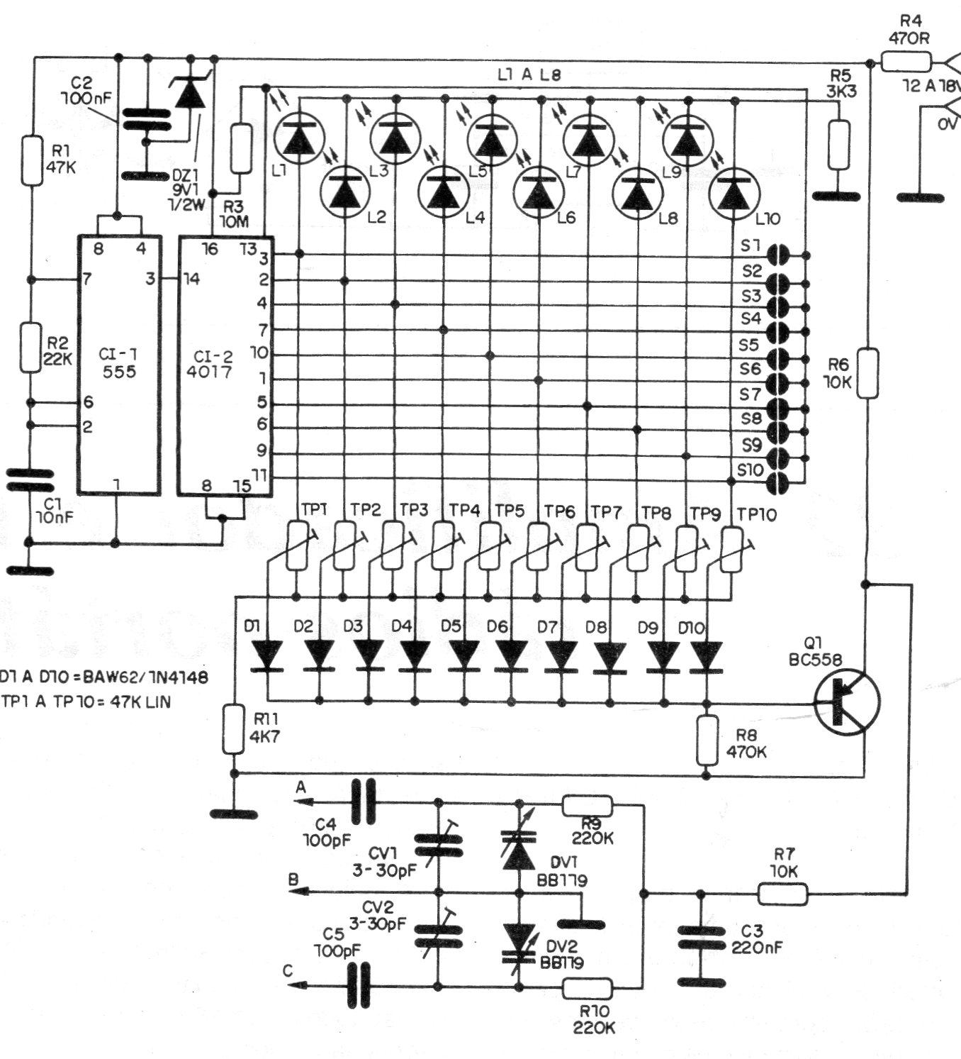 Originally designed for use in an FM receiver, this 1990 circuit can be adapted for other types of high frequency circuits such as oscillators and receivers. The circuit performs touch tuning with 10 options whose frequencies are selected in trimpots.