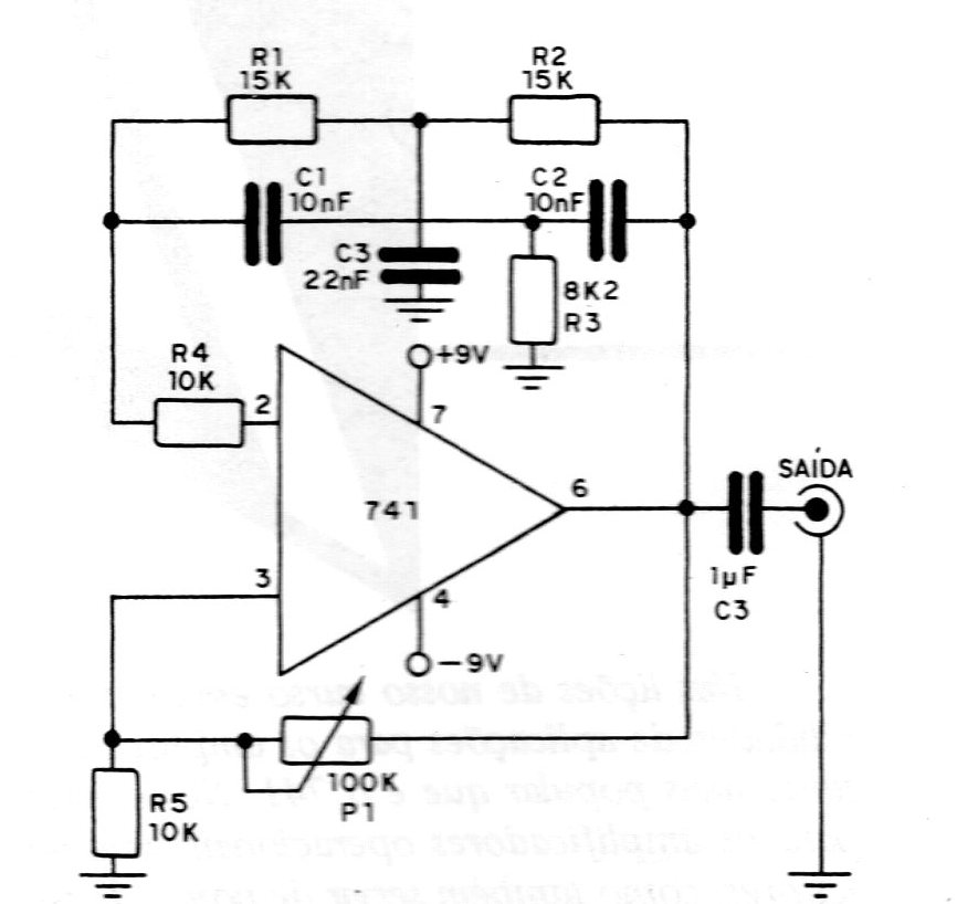 This circuit can be used as a source of signals for generators of different types, sirens, or musical instruments. As shown in the figure, only a 741 operational amplifier is used, its power coming from a symmetrical 9 VA source operating frequency of the circuit and, therefore, the signals obtained, depends on the values of the components of the twin-T. The formula is as follows: