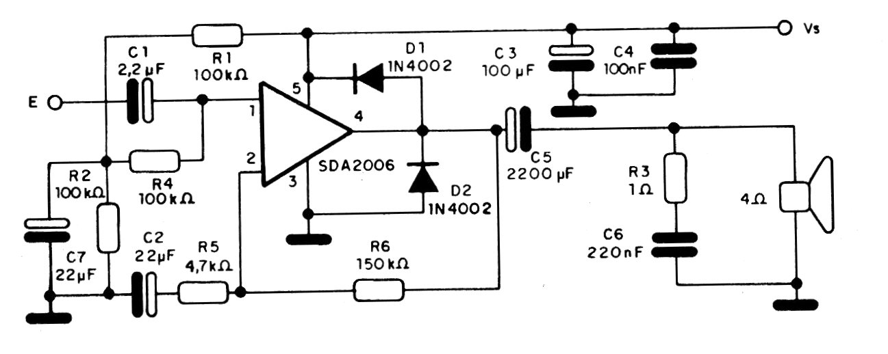 This amplifier must be supplied with a voltage of 24 V and the resting current is of the order of 4 mA. The integrated circuit must have a heat sink and the voltage gain is 30. The input resistance is 5M ohms.