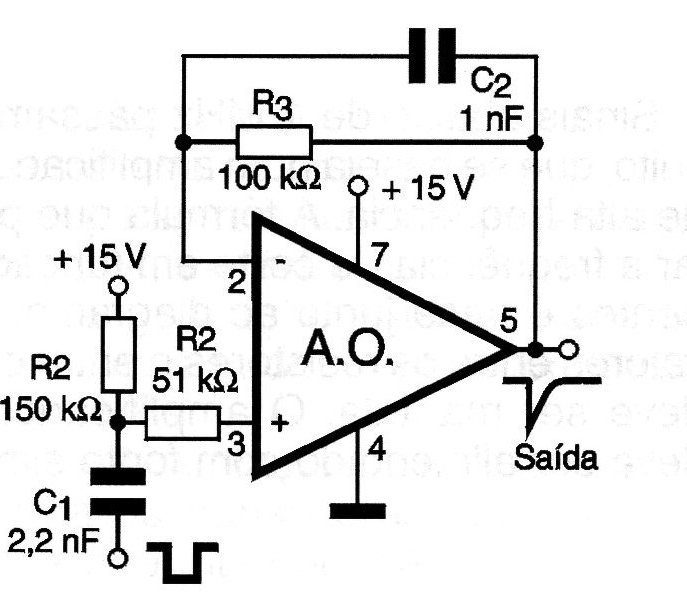 A rectangular signal applied to the input of this circuit becomes a negative pulse, which corresponds to the derivative of the function that describes the input signal. The values of the components C1 / C2 / R1 / R2 and R3 determine the function that will be obtained in the output. The operational amplifier must be powered with a 15 V source or according to its type.