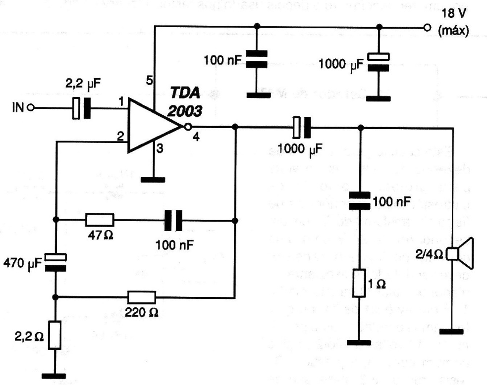 The amplifier presented with the TDA2003 can provide a power of up to 10 W (rms) in a load of 2 ohms, and a little less in load of 4 ohms. The maximum supply voltage is 18 V. The integrated circuit must be mounted on a good heat radiator and the components of the feedback network determine the voltage gain, which, in this case, is 100 times (220 / 2.2). The decoupling capacitors from the source must be mounted as close as possible to pin 5. The circuit does not include volume control, which must be in the preamplifier. The compatibility of the circuit with a supply voltage of 13.2 V allows it to be used in the car.