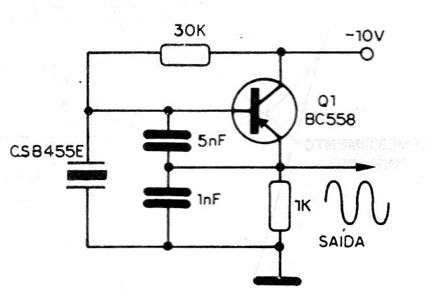 This circuit produces a signal at a frequency of 455 kHz, based on a ceramic resonator CSA455E, by Murata. The transistor can be any general purpose PNP and the output is sinusoidal. We can use this circuit on test instruments or receivers.