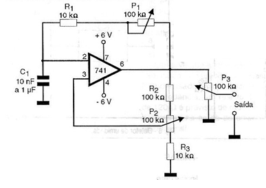 This circuit can generate signals in the audio range between fraction of hertz up to approximately 10 kHz without problems. We can use it as a basis for signal generators or simple musical instruments or even for alarms. In the figure we have the configuration used based on an operational amplifier of type 741. The frequency basically depends on P1, R1 and capacitor C which can assume the values indicated in the diagram. P1 controls the frequency while P2 controls the symmetry of the signal by fixing the reference voltage on pin 3 of the operational amplifier. The purpose of potentiometer P3 is to control the intensity of the output signal, and this component can be eliminated from the circuit according to its application. Remember that the output signal is low power with an impedance of approximately 50 ohms. It is also possible to use a power amplifier step in this case to excite loads like speakers.