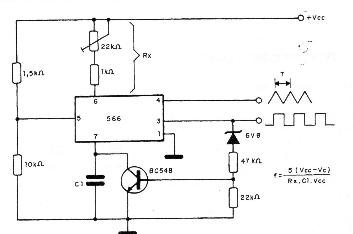 This circuit is based on a PLL 566 and generates positive ramps. The frequency depends on Rx and C and is given by the formula next to the diagram, where Vc is the voltage at pin 1. The supply voltage must be greater than that of the used zener.