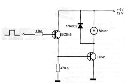 DC motors of 6 to 12 volts and currents of up to 2 amps can be controlled with this circuit. The TIP41 transistor admits equivalents and must have a good heat radiator. With a positive voltage between 0.6 volts and 5 volts, the motor is started.