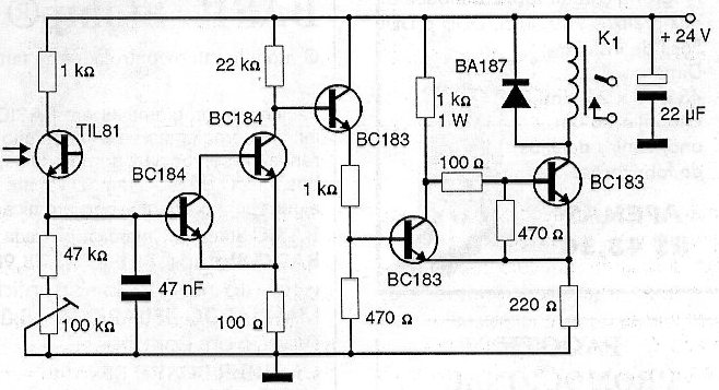 In this circuit the signal from the phototransistor is amplified by a Darlington stage and then applied to a trigger stage that controls a relay. The relay trips when the sensor is illuminated. The sensor can be any common phototransistor and the relay is a sensitive type for 12 V voltages with a coil of the order of 220 ohms. The sensitivity of the circuit is determined by adjusting the trimpot to 100 k ohms.