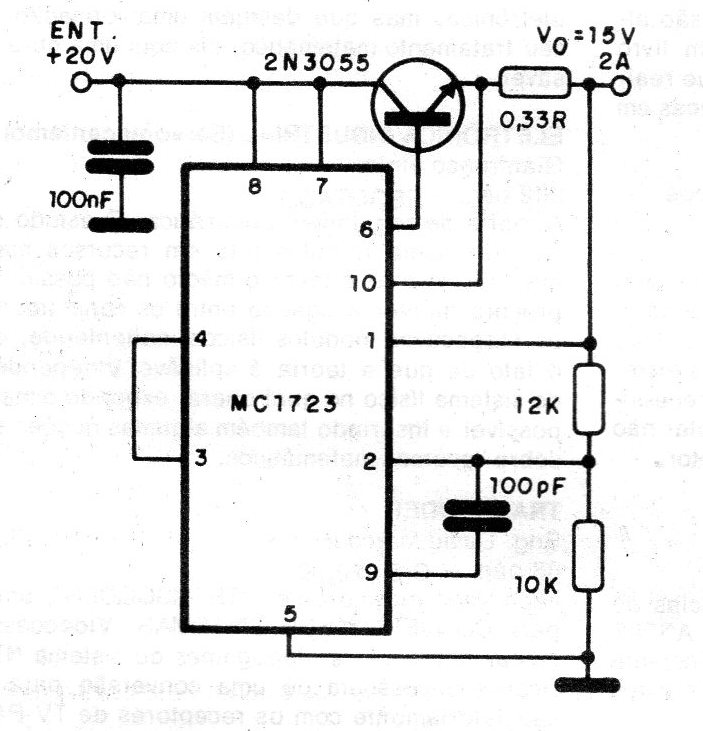 This circuit is suggested by Motorola and is based on a 1723 voltage regulator. The 2N3055 transistor must be mounted on a good heat radiator and the 0.33 ohms resistor is wire, with at least 1 W of dissipation. The recommended input voltage for this regulator is 20 V and the capacitors can be ceramic or polyester.