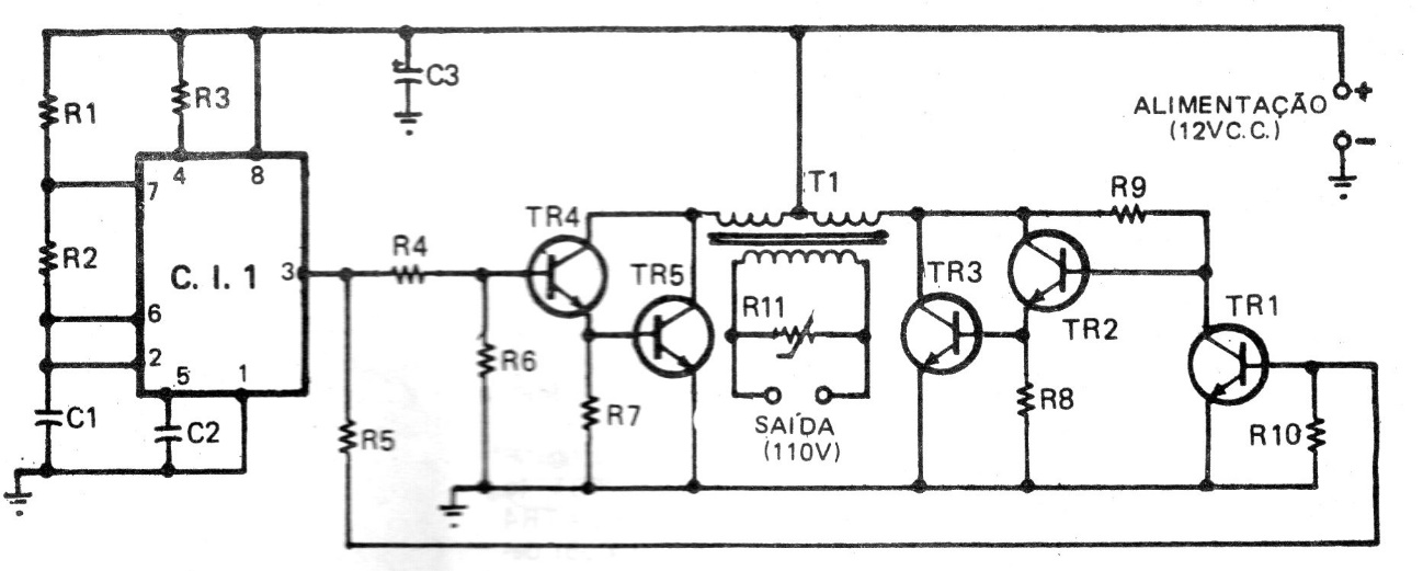 This circuit allows the supply of frequency sensitive loads, although the waveform is not sinusoidal. The circuit has a power according to the transformer, providing a power of a few tens of watts. The circuit is from a 70s documentation.