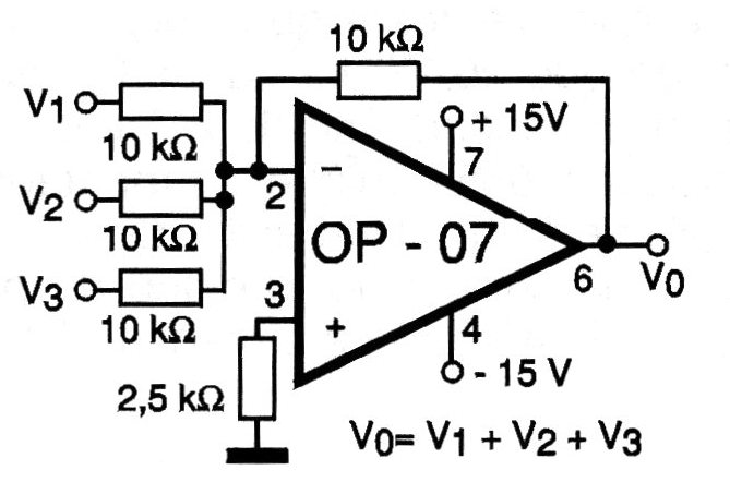The output voltage of this circuit is equal to the sum of the input voltages, if the result is within the range of supply voltages (the circuit cannot operate saturated). The operational amplifier admits equivalent and must be powered by a symmetrical source. More inputs can be added.