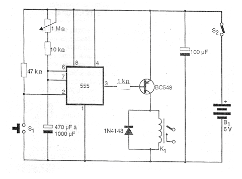 This timer activates a relay after a time interval of up to 15 minutes has elapsed, starting from the activation of S1. Larger intervals can be obtained with a larger pot, but there is a limitation of capacitor leakage. The system is activated when S1 is pressed and the output goes to low level, keeping the relay coil de-energized. The relay can be from 6V to 100 mA or if the reader prefers to supply the circuit with 12V, he can use a 12V x 50 mA relay. The maximum time delay can be calculated by the expression T = 1.1 x R x C where R is the resistance between the positive and the 6/7 pin of the CI and C is the capacitance between these pins and the ground.