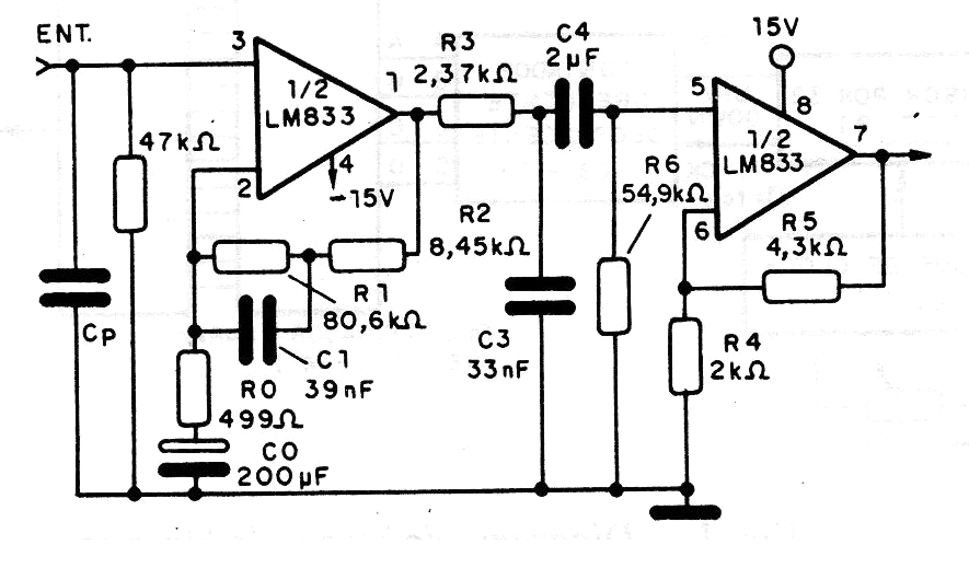 This circuit is suggested by National Semiconductor and with two operational amplifiers an LM833 provides a precision response in an RIAA amplifier. The gain is between 20 and 30 dB and the power must be supplied with a symmetrical source. The response curve is better than 0.1 dB at 20 to 20 kHz and the harmonic distortion is less than 0.01%. The output voltage will be between 300 mV rms and 1 V rms.