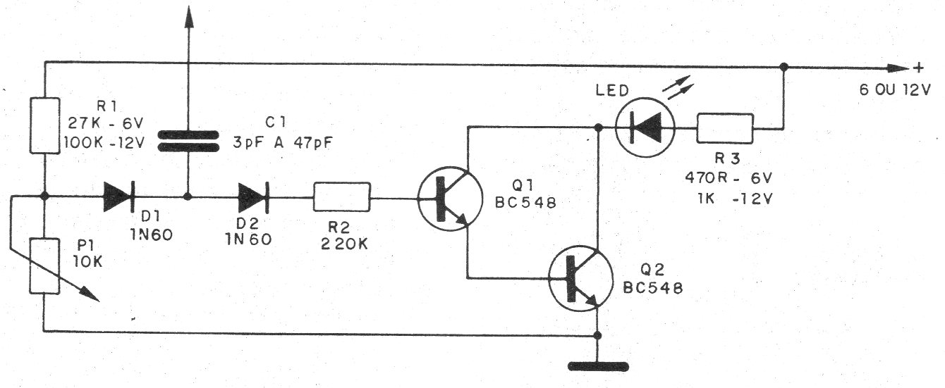 This circuit must have its input connected to the collector of the last IF transistor of the FM receiver. When a station is tuned in, the LED lights up. The circuit is from 1987 documentation and is powered by the receiver's own source.