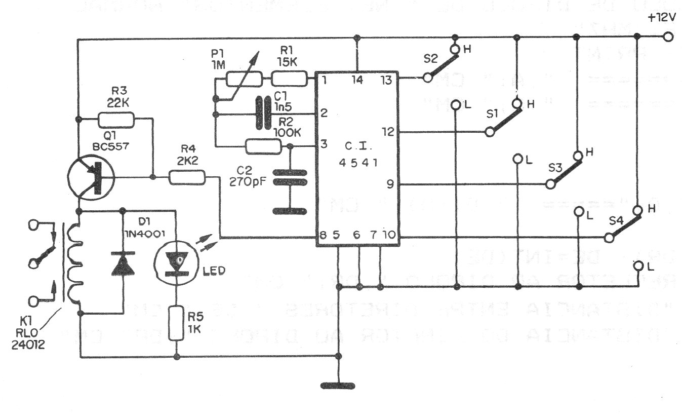 This circuit has four-time programming keys, according to the table given next to the diagram. The circuit must be powered by voltage according to the relay and the adjustment of the time scales can be done through P1.