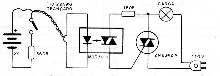 With an optodiac we have the circuit of the figure, suggested by MotoroIa, in which we do the direct control of a resistive load (a lamp) in the 110 V network. The trip is made remotely from a 5 V source, completely isolated. The MOC3011 is not suitable for use in a 220 V network. For applications in higher voltage networks, a resistor network must be used to equalize the voltage, as shown in the second figure.