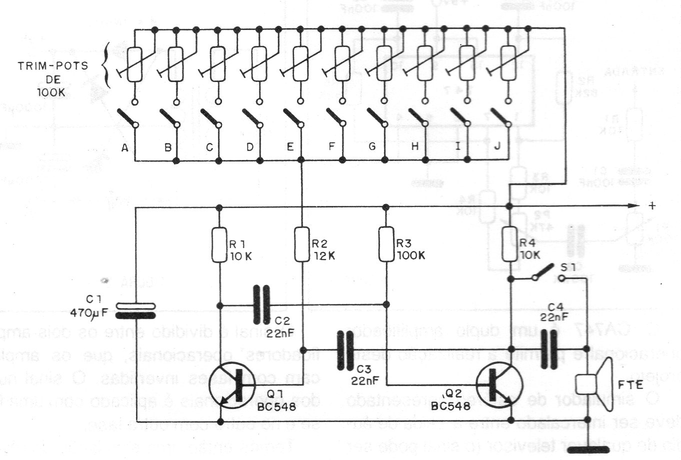 This simple monophonic electronic organ of several octaves was found in a 1987 publication. Powered by batteries, it directly excites a small speaker or piezoelectric transducer. The tuning of each key is independent through trimpots. The circuit can be powered by voltages from 6 to 9 V.