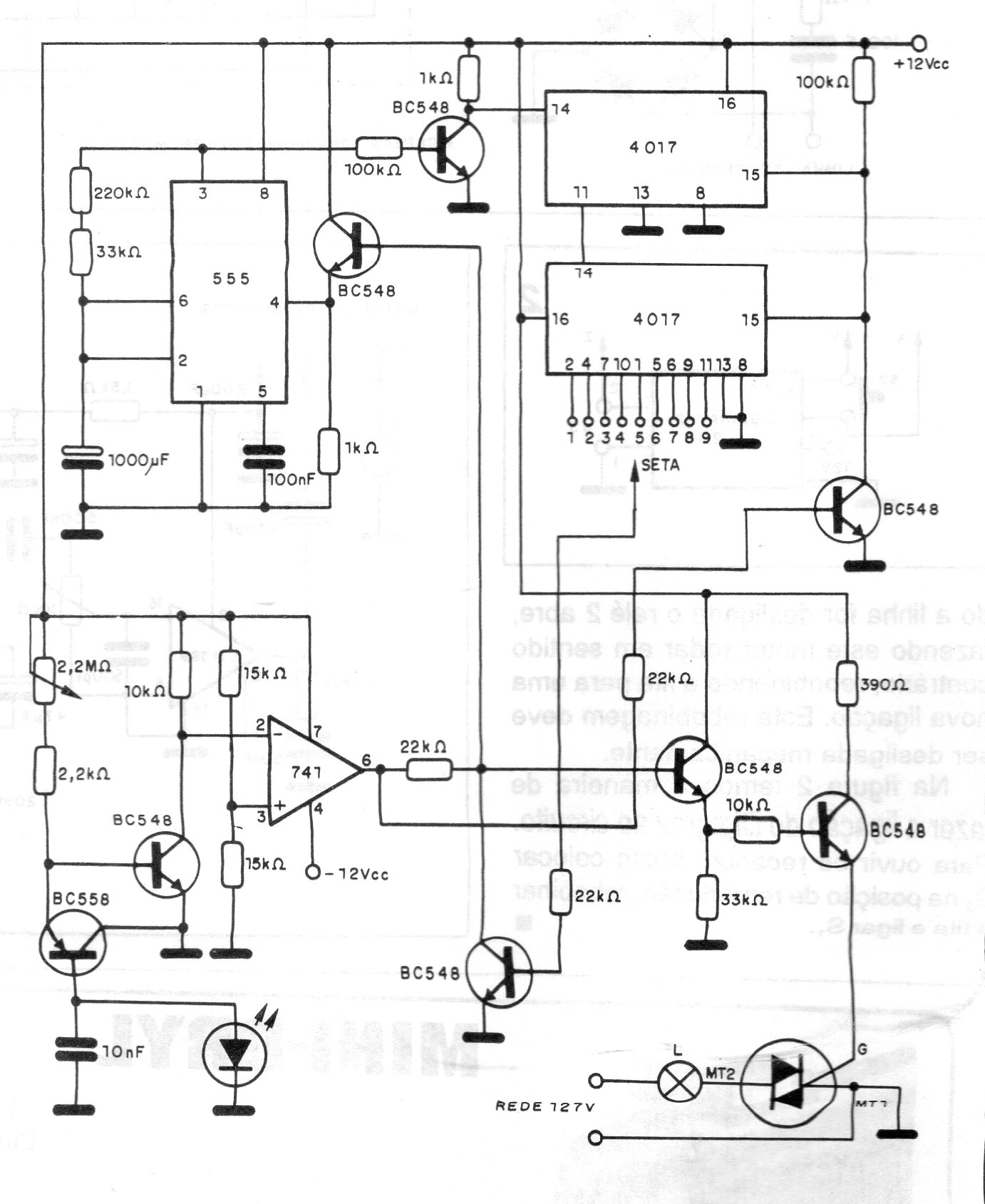 We found this circuit in a 1994 documentation. The circuit enables timing at dusk by keeping the lights on for a programmed time. The circuit turns on the lights the next day for the same time when night falls. The temples are selected by 4017. The lamps must be incandescent and the triac must be equipped with a heat sink.