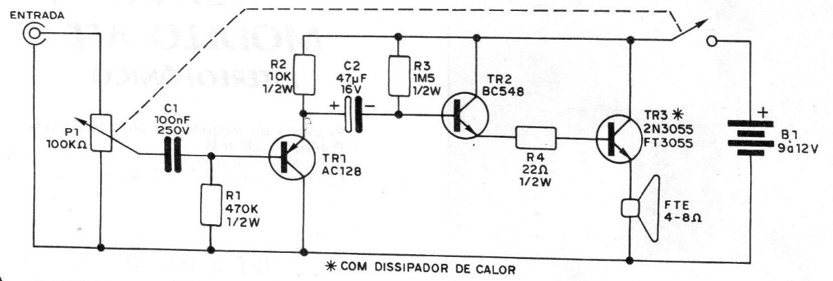 You can use this simple audio amplifier on your bench, on an intercom or as a power stage for a portable record player. The simplicity of this circuit is a factor that attracts at first sight, since only 3 transistors are used, and all are common. Q1 is the preamp and can be of any PNP type for general use, such as the BC557. Q2 is the driver, the BC547 or BC548 can be used for this purpose and finally the output transistor can be the 2N3055 or plastic equivalents. The circuit can be powered with voltages between 9 and 12 V from a source, since the current required by the circuit is relatively high. For the same reason, transistor Q3 must be mounted on a heatsink of approximately 5 x 10 cm.
