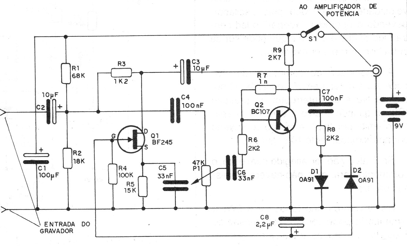 This circuit is from 1987 documentation. The original project was carried out with the tape recorders of the time in mind but can be used with modern digital recorders. The circuit is interspersed between the signal source and the amplifier input. Power is provided by a 9 V battery. The signal cables must be shielded.