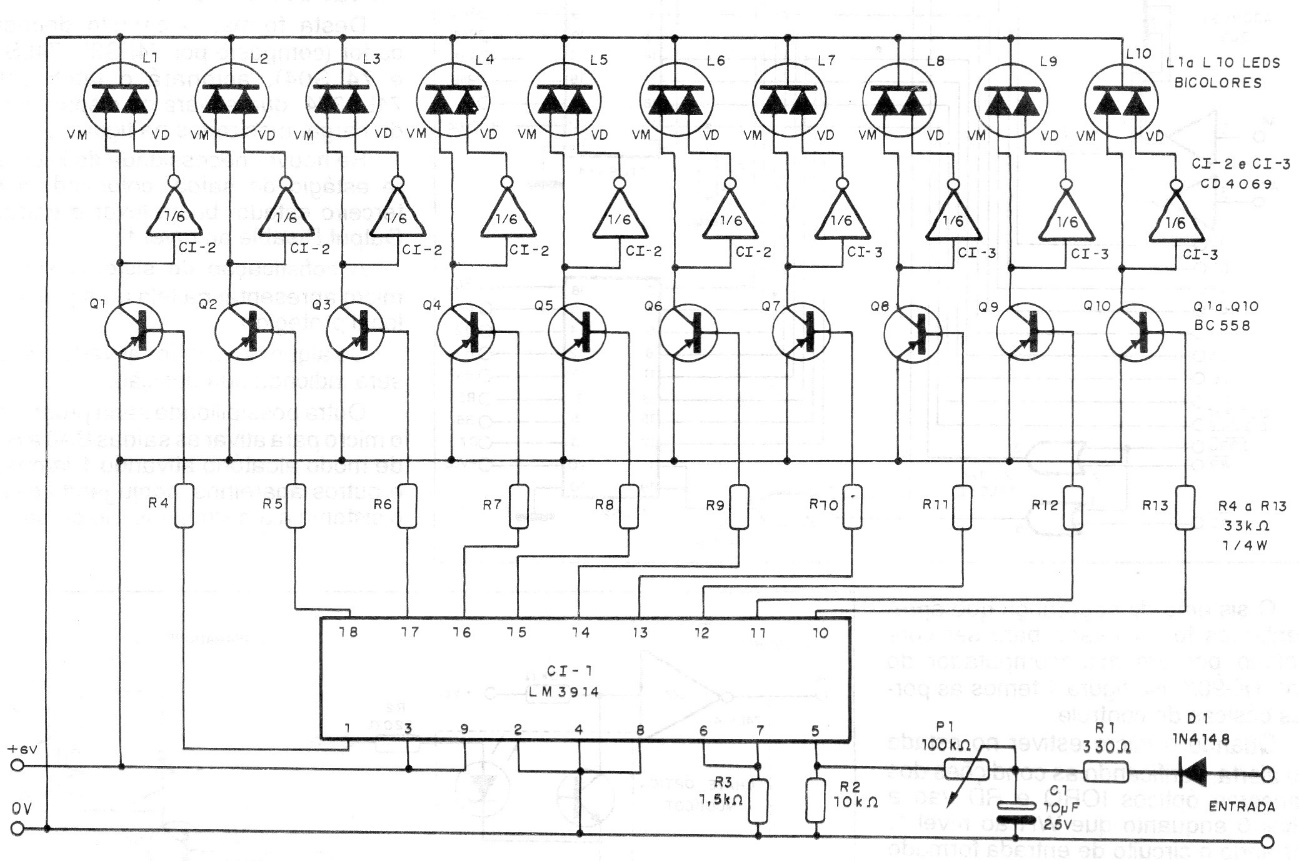 Based on the well-known LM3914, this circuit has a transistorized and inverters stage, triggering two-color LEDs. The circuit can be supplied with a voltage of 6 to 12 V and the adjustment of the operating point is made in P1.
