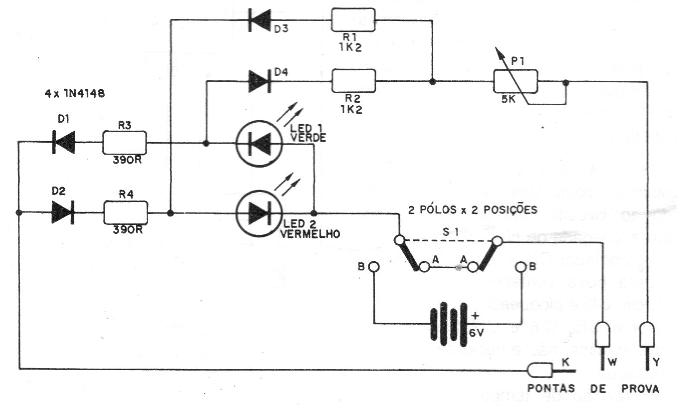 This circuit can be used to test continuity or even semiconductors. We found the configuration in a 1987 documentation. P1 adjusts the currents for the transistor test, depending on the gain. Power is provided from standard batteries.