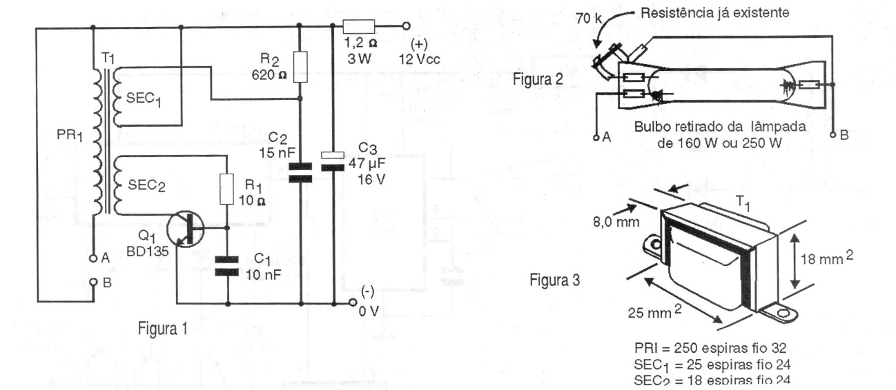 This simple inverter was found in a 1997 documentation. Its purpose is to apply a high voltage to a mixed lamp so that the gas inside it is ionized, producing a bluish light with a decorative effect. The circuit uses a homemade transformer that is detailed in the drawing.