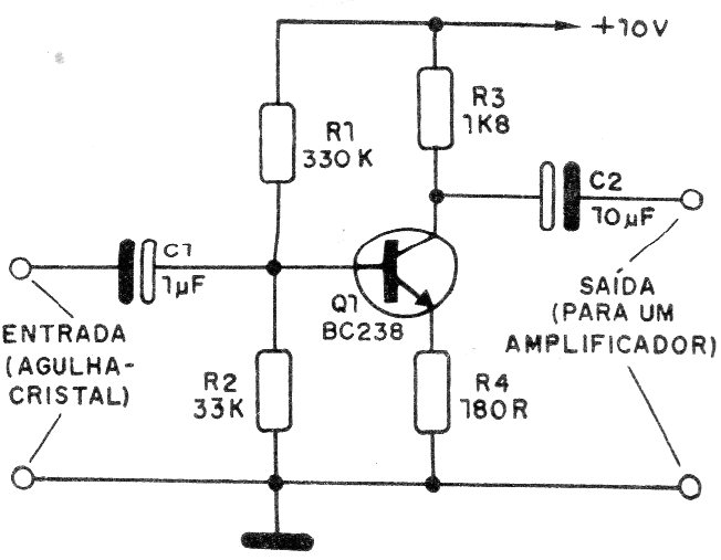 This traditional configuration was found in a 1988 publication. Its gain depends on the base resistors of the transistor and the consumption is very low. Signal input and output cables must be shielded.