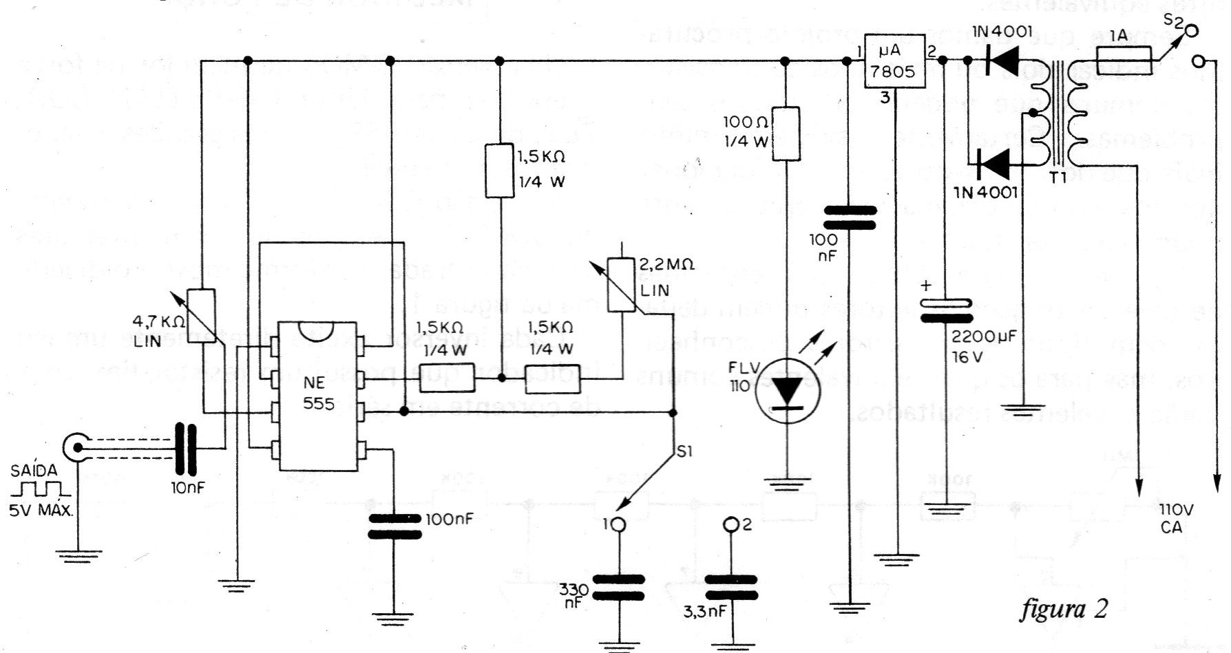 The frequency adjustment in each range is done by the 2M2 linear potentiometer. The 4k7 potentiometer, also linear, is used to adjust the strength of the output signal. This output has a maximum amplitude of 5 V and its waveform is rectangular. The transformer used in the power supply is 6 + 6V and must have a current of at least 250 mA.