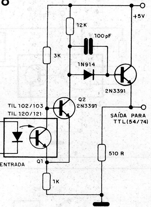 In the figure we have a Texas Instruments circuit for TTL interfacing using discrete transistors. The two transistors in this circuit form a Schmitt-trigger with TTL compatible output characteristics. Note that the power supply is 5 V.