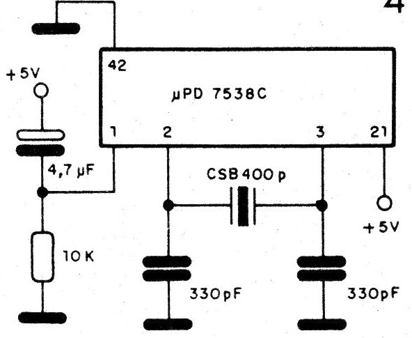 The circuit in the figure is suggested by Murata for an uPD75380 microprocessor and is based on a CSB400P ceramic resonator. The resonator frequency is 400 kHz.