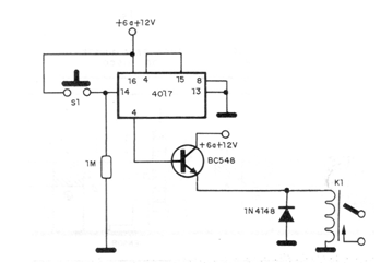 This circuit uses a pressure switch to turn a relay on or off. The supply must be 6 or 12 V depending on the relay used. The cable to the control switch must be short to avoid noise and ringing problems.