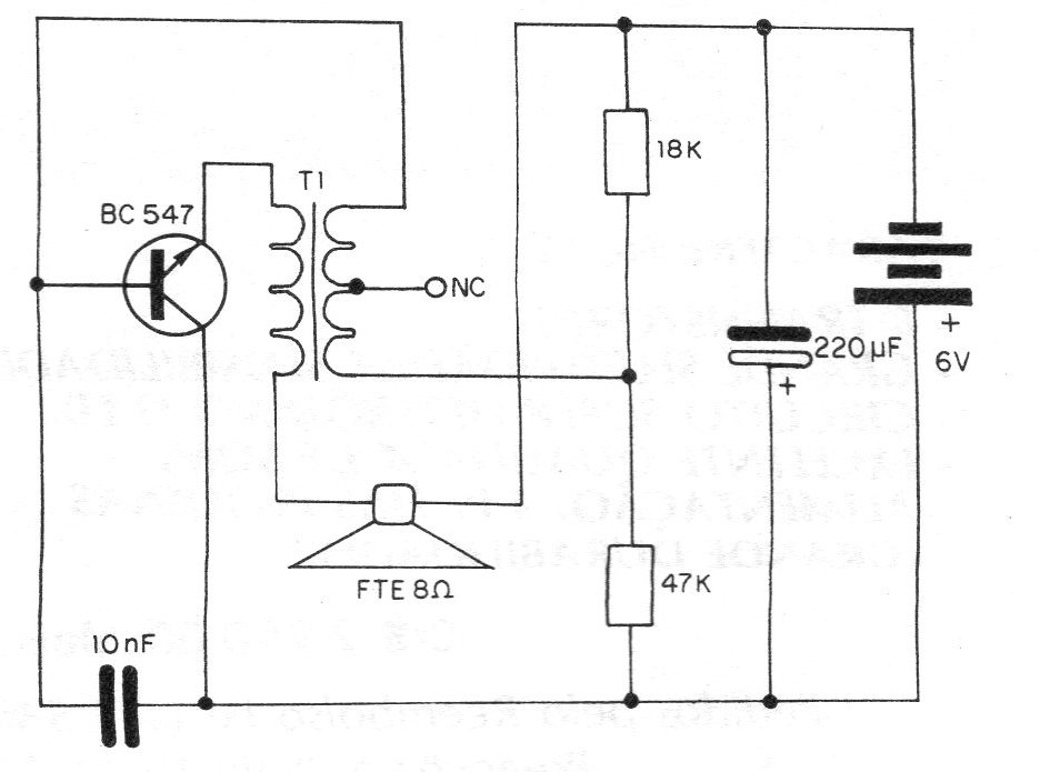 This very simple audio oscillator can be used as a call device for intercoms or even as an audible alert. We found this circuit in a 1982 documentation. The author suggests using it in conjunction with an intercom to call people in a distant location. The components used in this assembly are not critical, having used an AC127 transistor in the prototype. As this transistor is currently not very easy to obtain, we recommend replacing it with silicon equivalents, since the circuit is not critical, such as the BC547 or BC237. We observed that the operation of the oscillator in question depends a lot on the characteristics of the used transformer, which must have a primary winding of 200 to 2000 ohms and a secondary winding of 8 ohms.