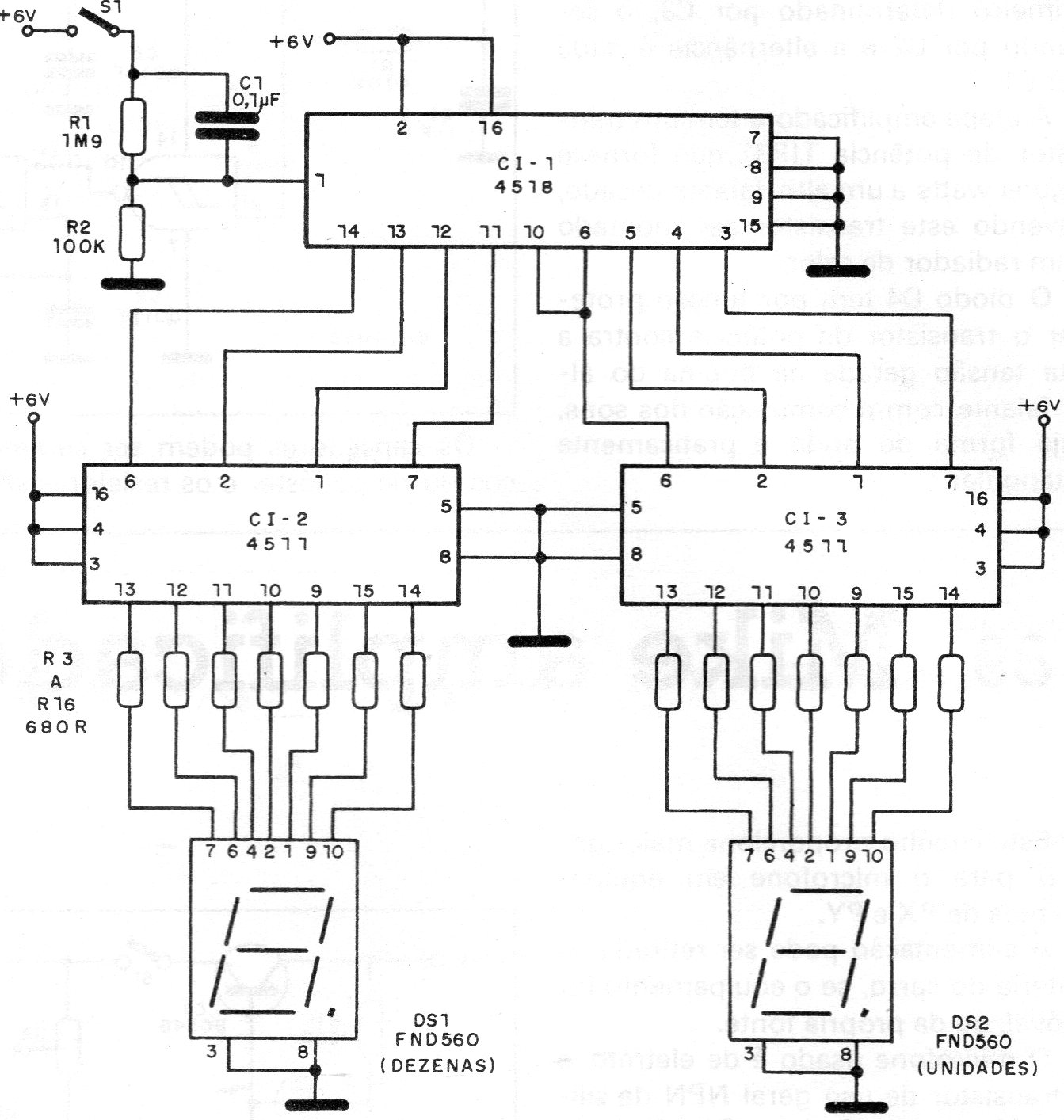 This basic digital two-digit circuit makes it possible to count the turns on a winder, for example, or pulses, on a passage counter. More digits can be added, and the counting is done by the pulses of S1 which can be a reed sensor, for example. The circuit is powered by 6 V and the displays are of common cathode.