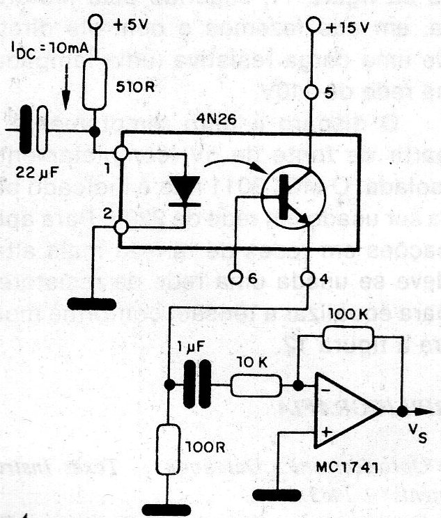 This circuit is suggested by Motorola, making it possible to use an optical coupler of type 4N26 together with an amplifier of type MC1741 (741), with a gain of -10 times. The AC signal applied to the emitter (LED) must have a peak amplitude of 5 mA, serving to modulate the beam of light, which then appears as an equivalent signal at the output of the operational amplifier. Note that, despite the existence of a 10mA bias current in the emitter, only the AC component appears at the operational output.
