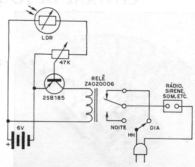 This circuit is from a 1982 publication. How about waking up to the first rays of sunlight? No, you do not need a good cock for that! The circuit we give here takes the place of the rooster and wakes you up with the light of dawn, triggering an alarm, your bedside radio or whatever you want ... An LDR is the sensitive element that, when receiving the first dawn rays, activates a relay. The relay can then be used to connect any device the reader wishes. Simple to assemble and highly efficient, this device can stay on all night without danger of wear to the batteries, due to its low consumption.
