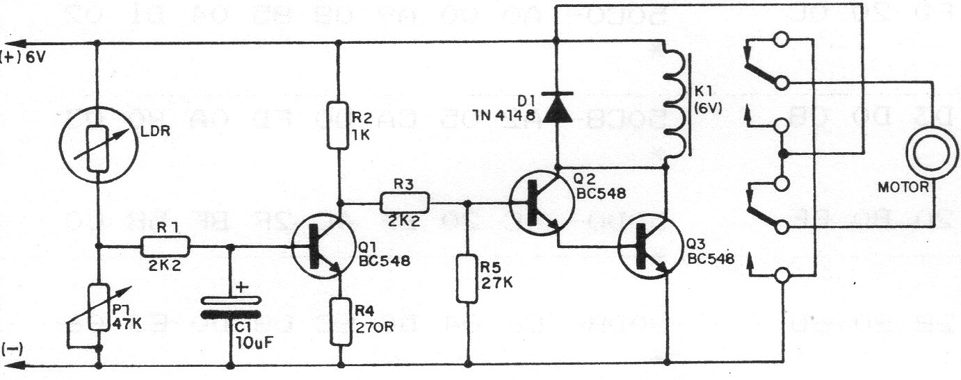 This circuit makes it possible to reverse the direction of a DC motor through a relay controlled by a beam of light. The trigger point is adjusted in P1. The relay is 6 V which is the voltage used to supply the circuit. We found this circuit in a 1987 technical documentation.