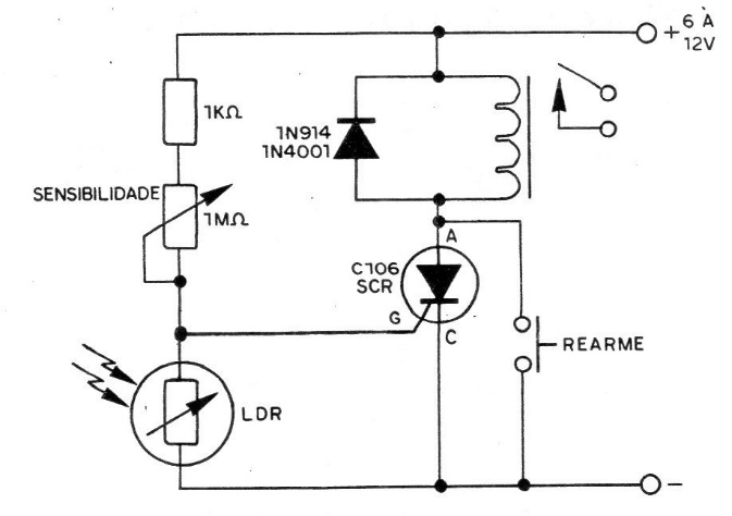 The high sensitivity of this type of SCR recommended in our assemblies allows it to be triggered by low current sensors such as LDRs. Thus, we have two possibilities for the LDR to command the triggering of the SCR when a focus of light that falls on its sensitive surface is cut, or else to be triggered when the light falls on its sensitive surface. In the figure we have the circuit in which we use a 6 to 12 V power supply and a relay that can control a higher power load. The LDR is connected between the cathode and behaves to the SCR so that when light falls on its surface, its low resistance serves as a short circuit for the trigger voltage. When the light is cut off, the increase in resistance will cause the current to circulate through the SCR gate, triggering it. The potentiometer serves as a sensitivity adjustment.