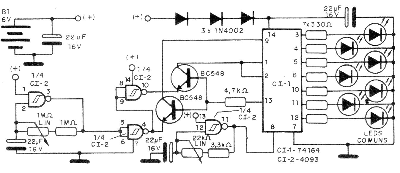 This sequential light effect was obtained in a 1992 documentation, but it can be easily assembled today, as the components used are common. Effect adjustments are made in two potentiometers and LEDs are common in any color. The supply can be done with voltages from 6 to 9 V.