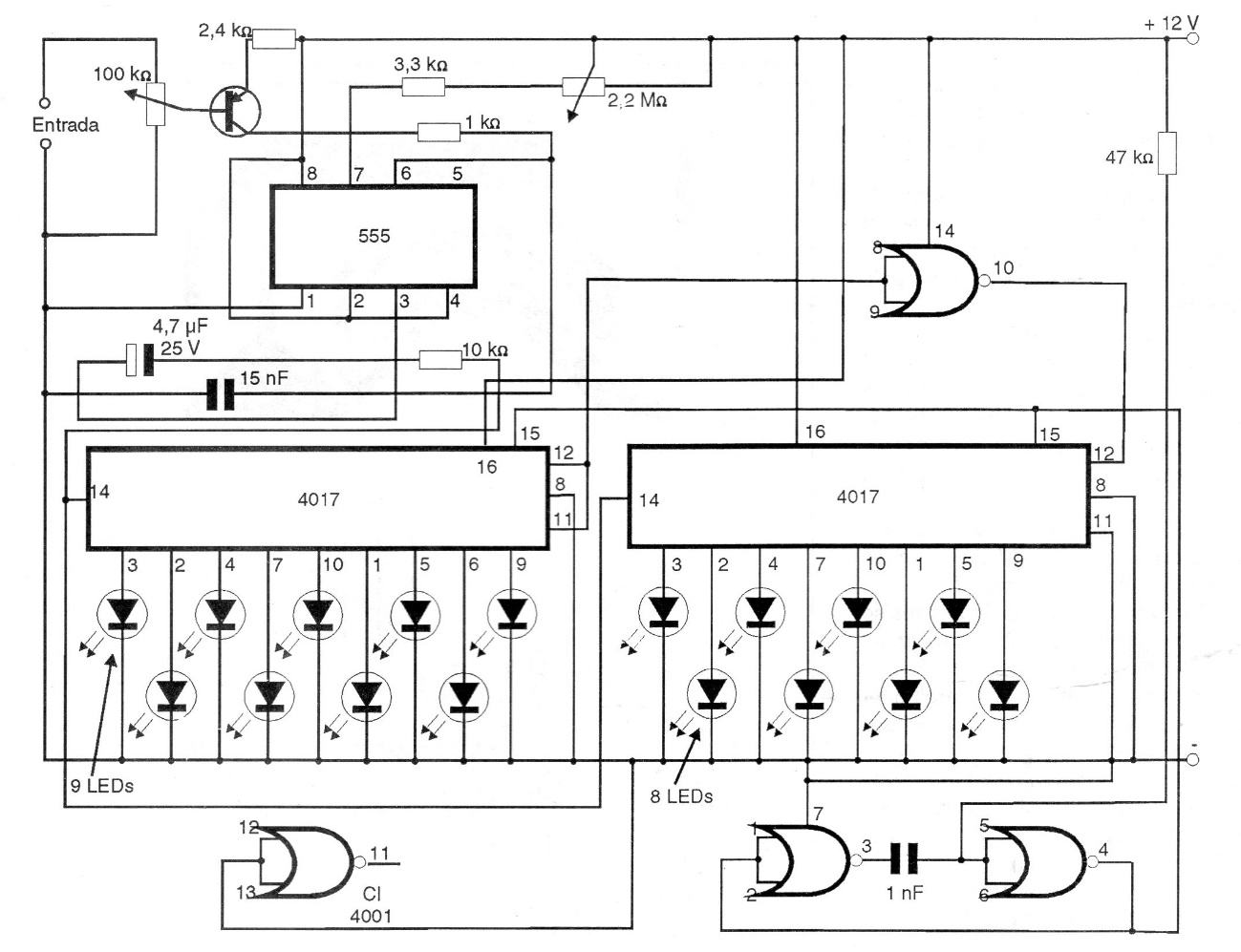 This VU circuit has a different effect given using two 4017. The circuit is from 1997 documentation and is connected to the output of any amplifier. The original design did not provide for an entry protection that would be recommended. A 1k resistor can be used in series with the base of the transistor or the input. The original circuit was designed to be used in the car, but it should work with voltages from 5 to 12 V.