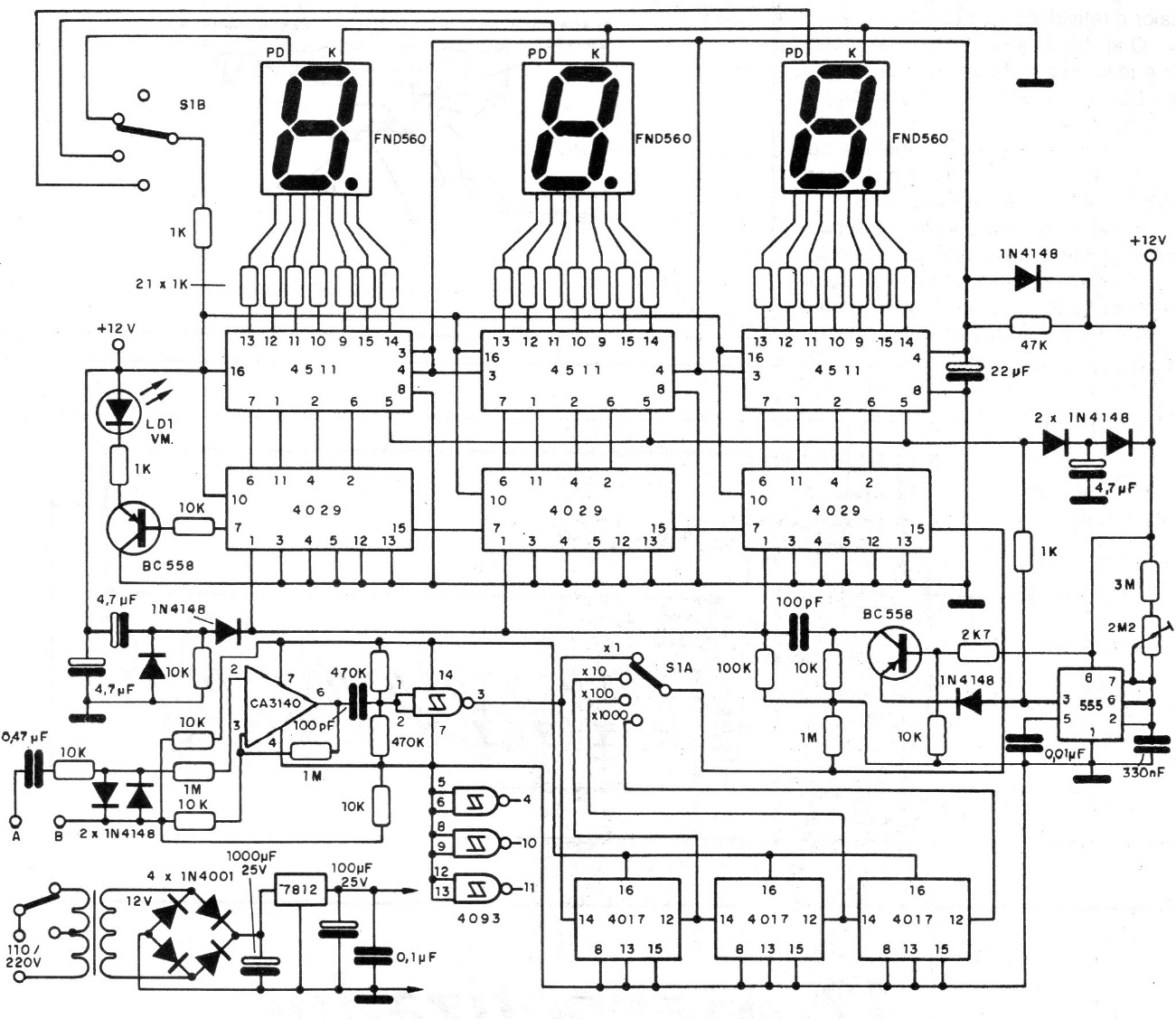 This circuit can measure frequencies up to just over 1 MHz and uses CMOS technology. The circuit is from 1990 documentation and has three-digit measurement definition. Adjustments are made in the trimpot and accuracy depends on them. The circuit operates with 4 frequency bands and includes the power supply.