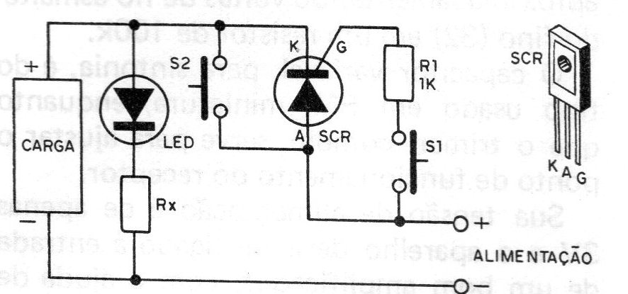 To control direct current loads, under voltages between 12 and 200 V, and currents up to 3 A, we have this interesting circuit, found in a publication in 1981. The base of the circuit is an SCR, type MCR106, TIC106 or IR106, which works like a switch. By pressing S1 momentarily, the SCR turns on, carrying the current to the load circuit, which remains powered until S2 is also momentarily pressed, when then the SCR shuts down. The indicator LED serves to “tell" when the load circuit is receiving power. In applications where the load current is greater than 1A, the SCR must be mounted on a heat radiator. The Rx resistor, connected in series with the LED, has values that depend on the load voltage. For 3 V on the load, the resistor will be 100 ohms and for 48 V, its value will be 4k7. We see that 3 V on the load means 5 V of power, since the SCRs usually have a voltage drop of about 2 V. For this reason, we recommend the circuit for voltages above 12 V., so that the drop is not sensitive in the load, intermediate Rx values can be achieved by a simple proportional calculation. When connecting to the load circuit, it is very important to obey the polarity of the source and the control.