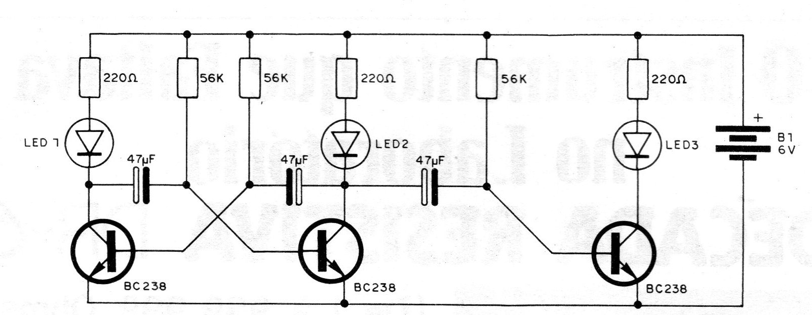 We found this circuit in a 1980 documentation. The flasher uses 3 transistors in the configuration of an astable multivibrator that feeds 3 LEDs. Two transistors form the multivibrator and the third works in conjunction with the multivibrator, however with a delay given by capacitor C3. The basic frequency of the LEDs is given by capacitors C1, C2, and C3 which, according to the author, can have values between 33 uF and 100 uF. The recommended transistors are BC238, BC 237 or BC548, but any silicon NPN should work satisfactorily. The power for this circuit comes from 4 common batteries that together supply a voltage of 6 volts.