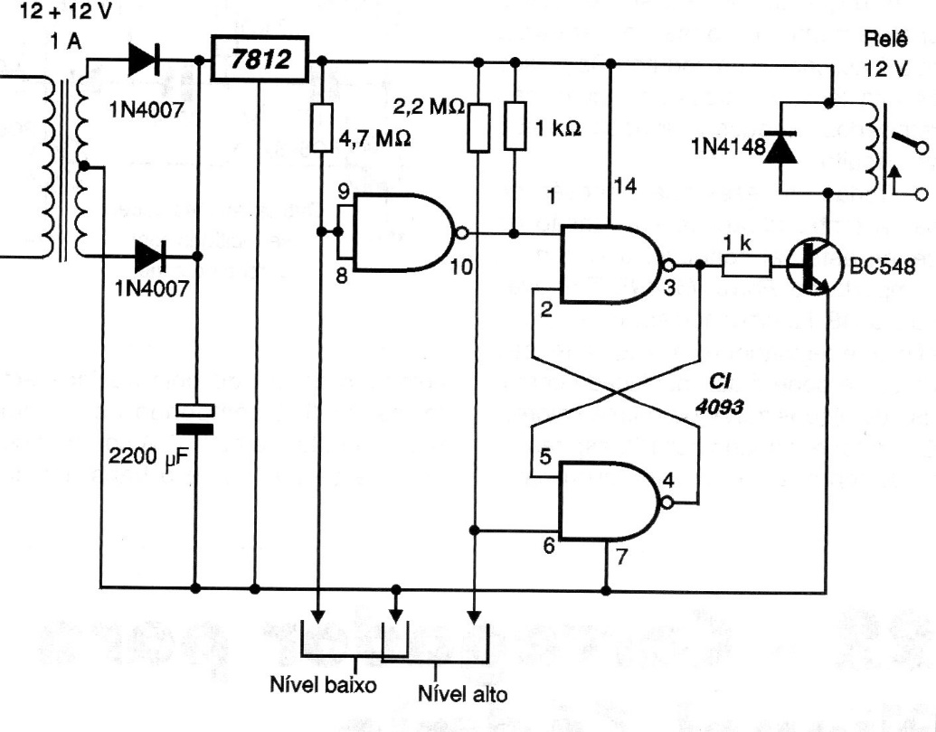 This circuit is from 2001 documentation with the purpose of controlling a pump that fills a water box and turning off when full. The sensors are wires with the peeled tips placed at the desired levels (minimum and maximum). The relay is 12 V and must have contacts according to the pump current.