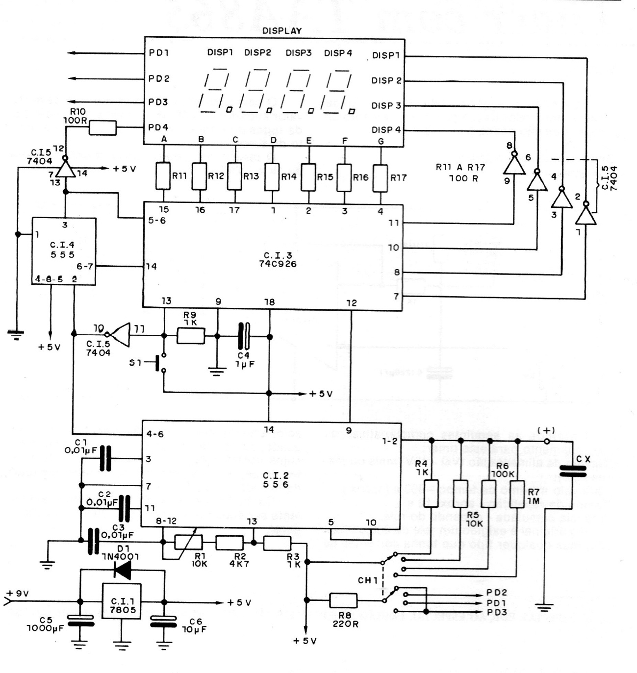 This circuit was found in a 1986 documentation and it may be difficult to obtain some of its components. The circuit is TTL and must be supplied with 5 V. The calibration of the different scales must be done in R1 and the precision depends on the resistors used.
