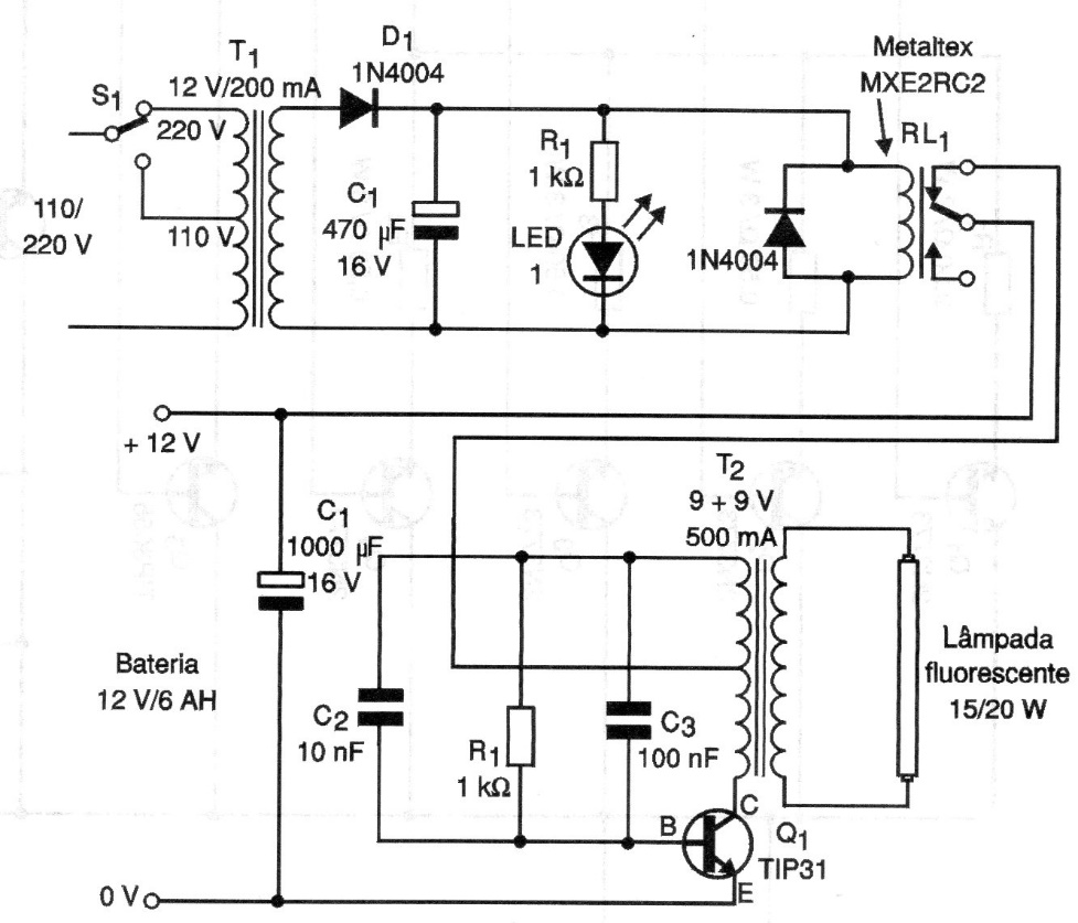 This emergency light circuit does not include a battery charger or an intelligent system to operate only when in the dark. However, it does have an inverter system to power a fluorescent lamp.