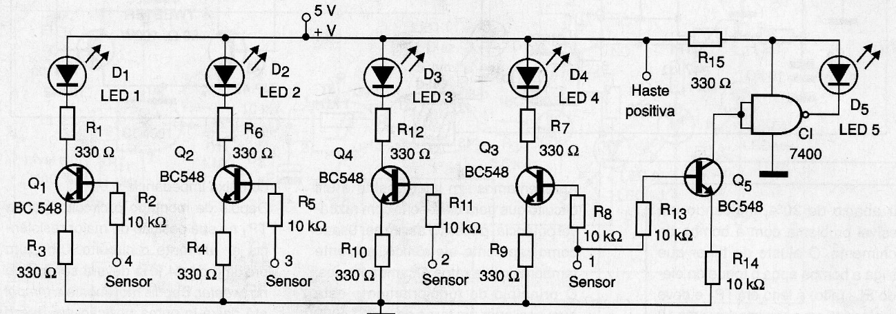 The circuit shown shows the water level in a reservoir, showing them by turning on LEDs. With LED4 lit, the box is completely full and with LED1 lit only the box is at its minimum level. The sensors are copper rods installed inside the box on its side, with defined distances that will determine the trigger points. The positive rod must be placed at the bottom of the box. Each level sensor is connected to the base of a transistor that serves as a trigger for the LED corresponding to the level.