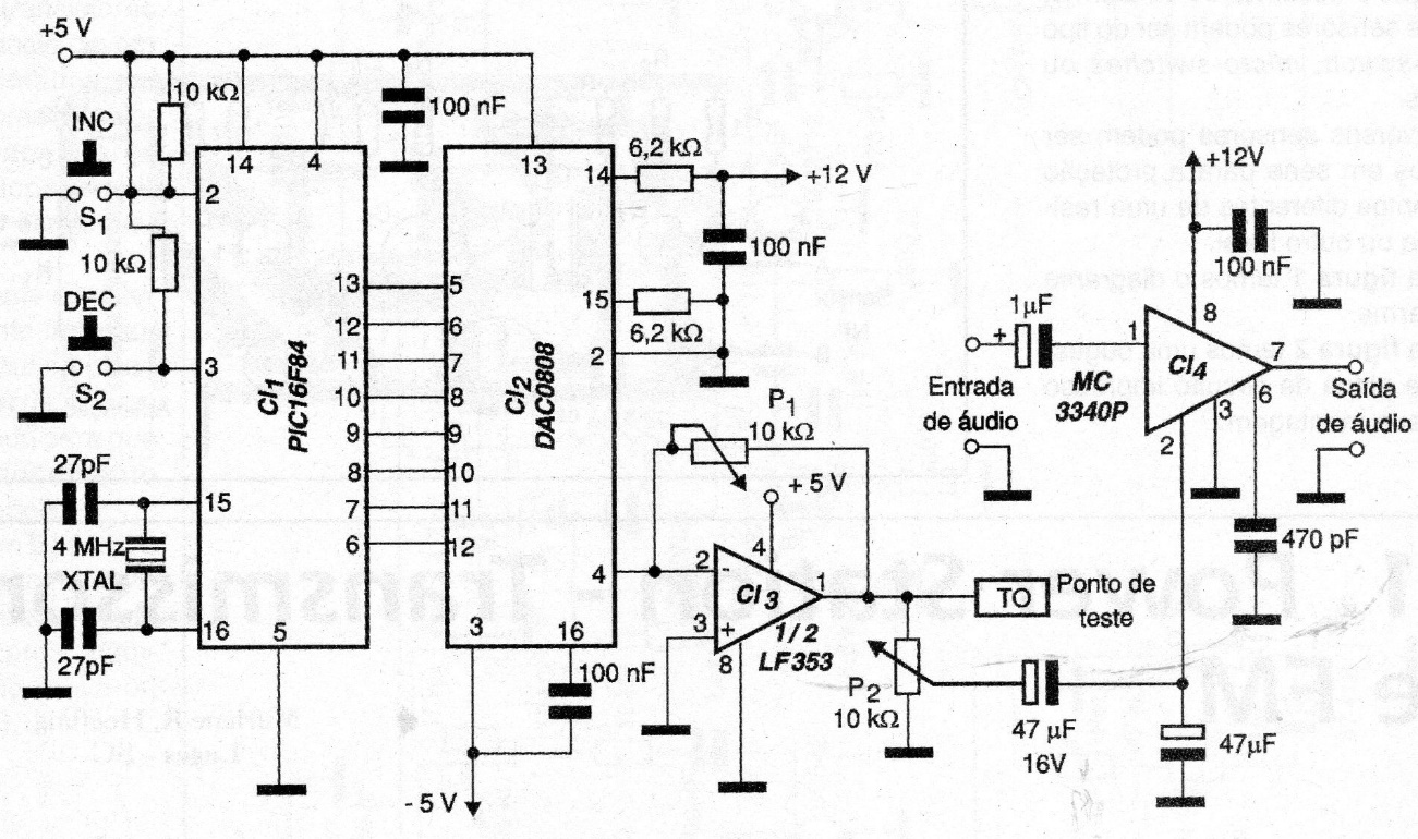 In the circuit that uses a PIC16F84, the audio present at the input will have its level controlled by the DC voltage applied to pin 2 of the MC3340P. The audio level displayed on the output can be changed between zero and an amplitude value four times greater than the signal applied to the input. To achieve a DC voltage, which will be applied to pin 2 of the MC3340P, a PIC16F84 was used which is the "brain: of the circuit, an analog-digital converter DAC0808 and an operational amplifier LF353. The control process is as follows: When presses one of the keys (S1 or S2), which respectively increases or decreases the 8-bit counter of the PIC, the value of the counter is transferred to the DAC0808 which converts it to the digital form of the PIC in an equivalent current. LF353 converts it to an equivalent DC voltage. The converted voltage is applied to pin 2. MC3340P Potentiometer P1 is the scaling of the operational amplifier and should be adjusted, preferably to 5.187 k. P2 is the amplitude control.